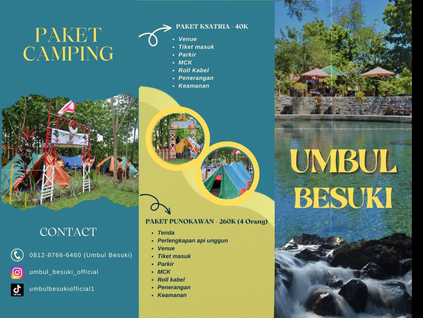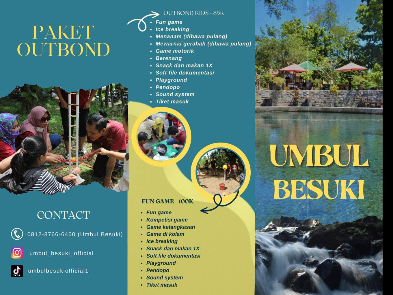- Outbound dan Camping. Pengunjung yang memiliki rencana untuk Camping dan Outbound, Umbul Besuki menjadi salah satu pilihan tepat. Memiliki area yang cukup luas dengan berbagai fasilitas yang ada, akan mempermudah terlaksananya agenda.
