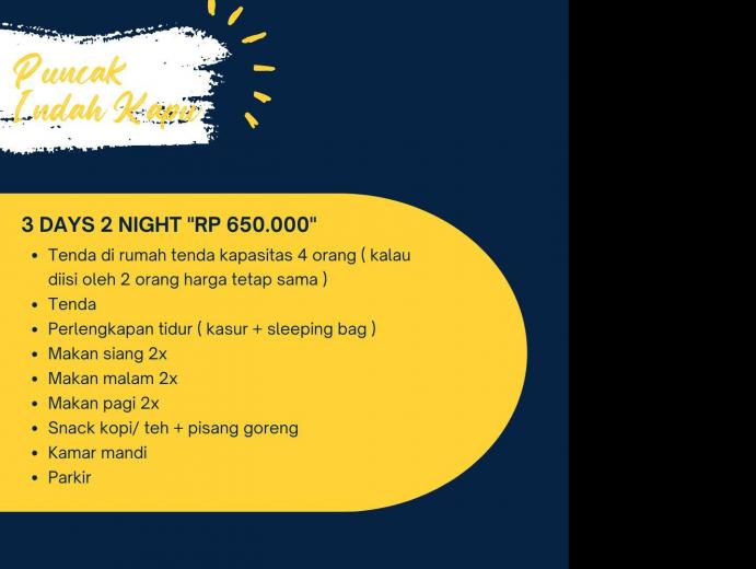2. Paket wisata Camping, di desa Sani - Sani ada 3 lokasi untuk kita bisa menikmati wisata camping, 1 lokasi di pantai dan 2 lokasi lagi di puncak. Masing - masing lokasi camping ini menawarkan pengalaman yang berbeda.Suasana camping di area pantai kita bisa menikmati sunset yang sempurna dengan pemandangan lautnya dan gugusan pulau padamarang yang tepat berada di depan pantai, Kami berikan nama lokasi camping di pantai itu Sunset Beach Camp dengan kapasitas bisa menampung 50 tenda .