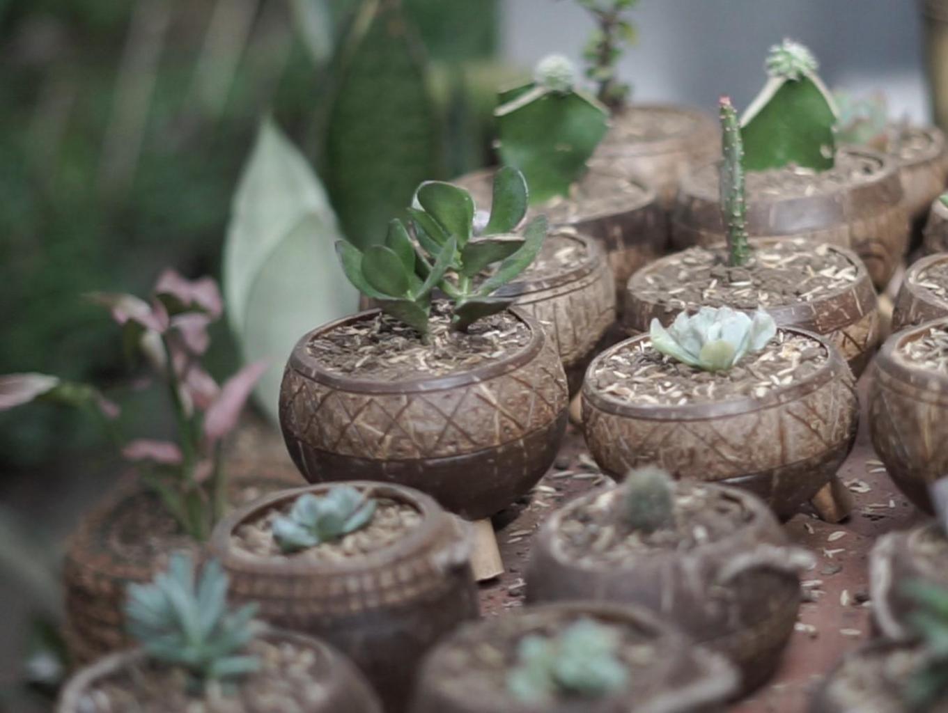 Di olah dengan cara kelapa di kupas isi buah kelapa di jadikan minyak kelapa ( minyak goreng ) batok kelapa kemudian keringkan kemudian di amplas